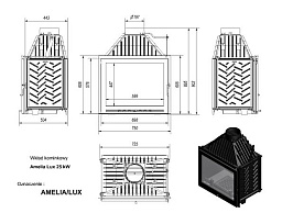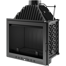 Цельное стекло, боковое стекло - справа. Серая отделка. Топка выполнена из чугуна.
