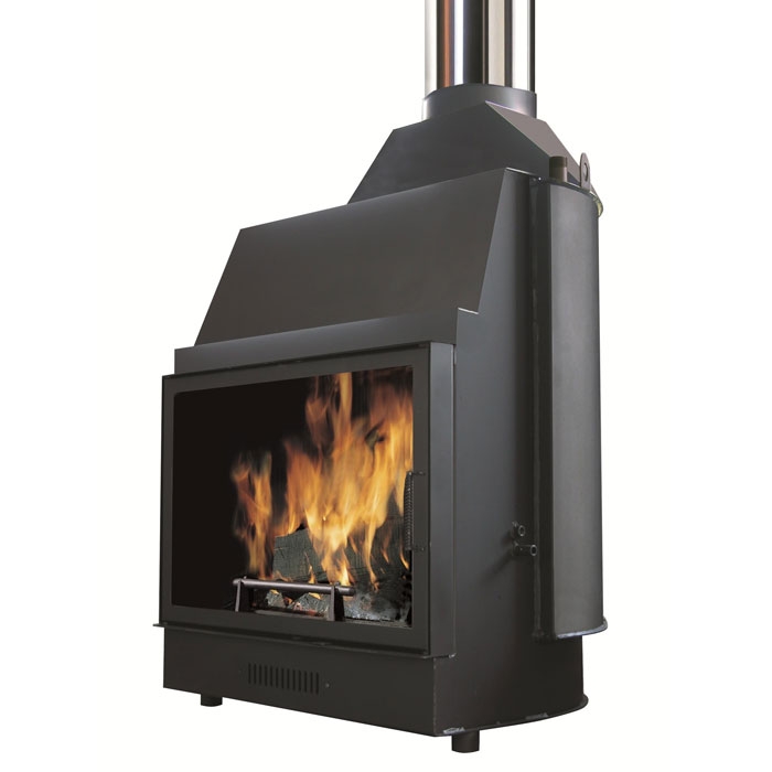 Каминная топка для открытой или закрытой системы. Корпус из утолщенной стали, чугунный очаг, витрокерамическое стекло, резистентное к терпературе до 800°, бак для воды на 60 литров.