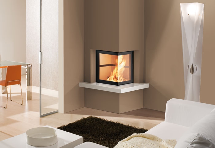 Угловая дровяная топка с внутренней частью из огнеупорного материала и обширным обзором огня.