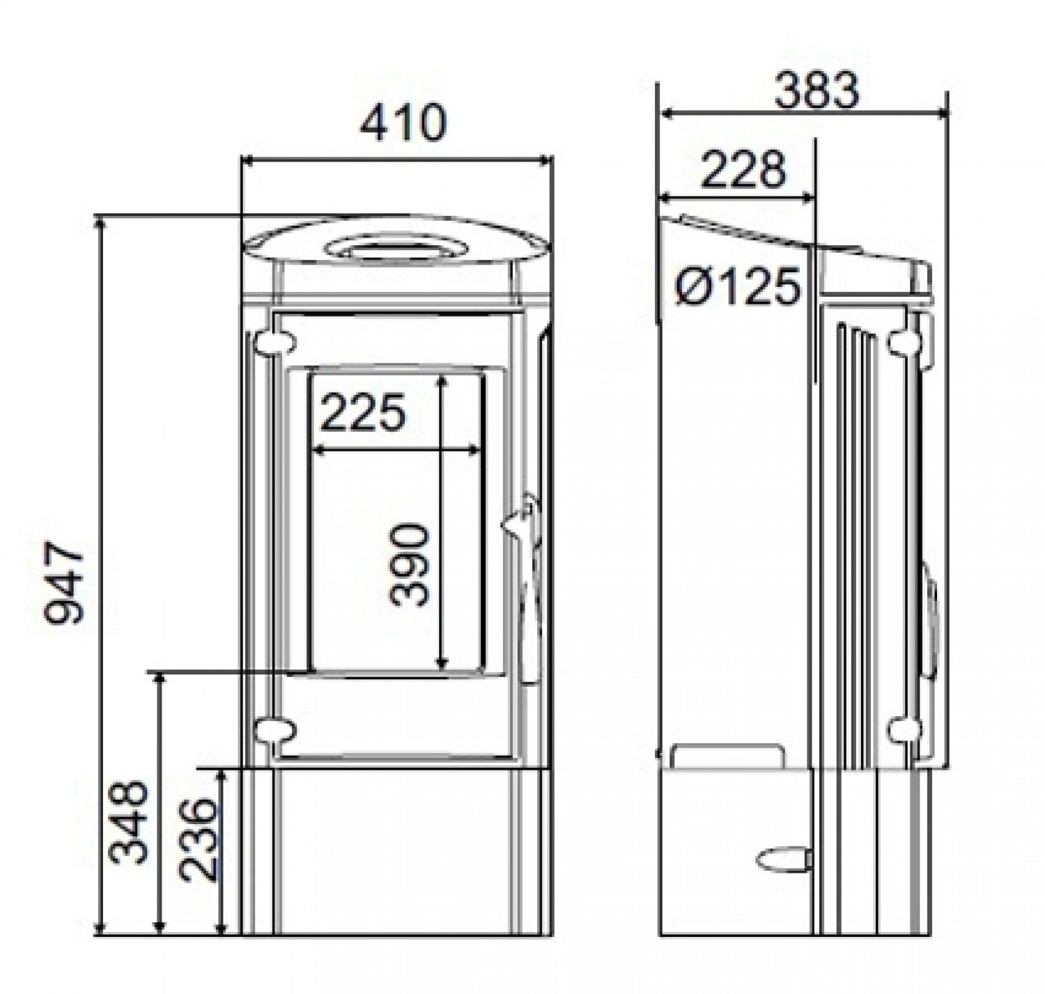 Черная чугунная печь с закругленными сторонами. Внутренний обклад "медовые соты". Вертикальная загрузка дров. Дрова до 33 см.