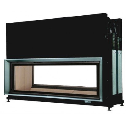 Двухсторонняя каминная топка с прямым стеклом. Топочная камера футерована шамотом. Подъёмный механизм двери (система Easy-Lift) с одной стороны. С другой стороны дверца откидывается для чистки. Ширина дверки 1631 мм. Высота дверки 502 мм. Возможно подключение воздуха извне.