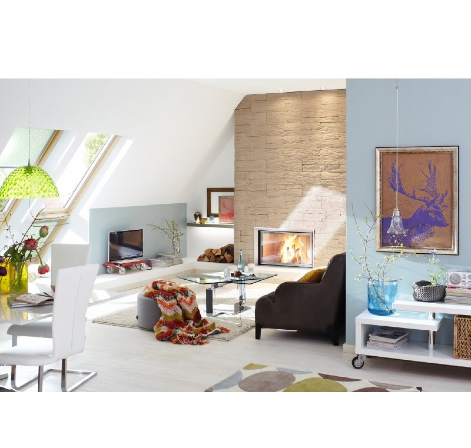 Каминная топка с прямым стеклом. Топочная камера футерована шамотом. Подъёмный механизм двери (система Easy-Lift). Ширина дверки 851 мм. Высота дверки 502 мм. Возможно подключение воздуха извне.