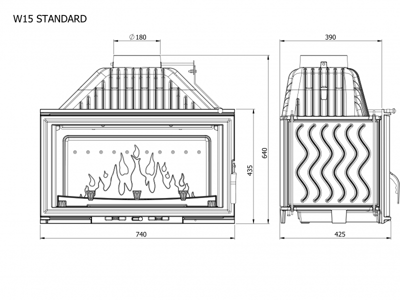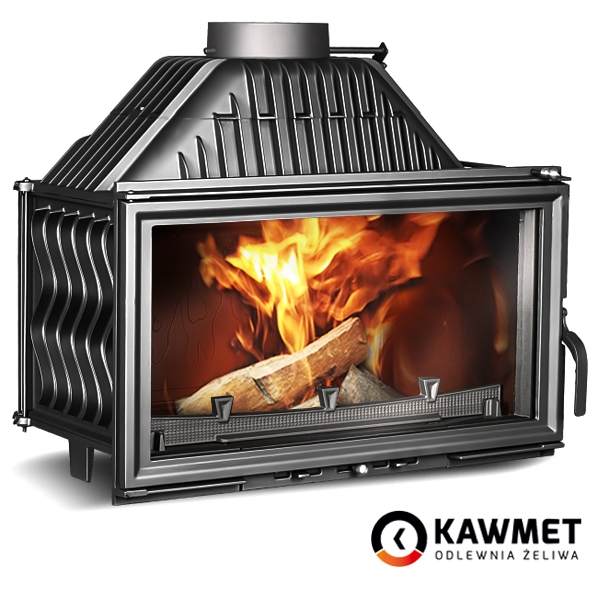 Каминная топка W15-12 кВт является классической топкой производимой заводом KAWMET по современным технологиям, топка выполнена из толстого чугуна класса EN-GJL- 200 и оборудована подводом наружного воздуха в камеру сгорания, встроенным шибером для регулировки процесса горения и дымоотведения, и более точной регулировкой подачи воздуха через нижнюю часть дверцы под колосниковую решетку, открыв ее на максимум, вы подаете к дровам оптимальное количество воздуха для быстрого розжига.
