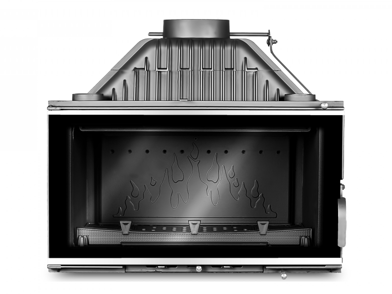Повышенный КПД и теплоотдачу обеспечивает чугунный дефлектор, который расположен над камерой сгорания каминной топки KAWMET. Назначение дефлектора - направить недогоревшие частицы дровяного газа в центральную часть камеры сгорания, где происходит повторное догорание. Также дефлектор увеличивает тепловую эффективность топки путем удлинения пути прохождения продуктов сгорания.