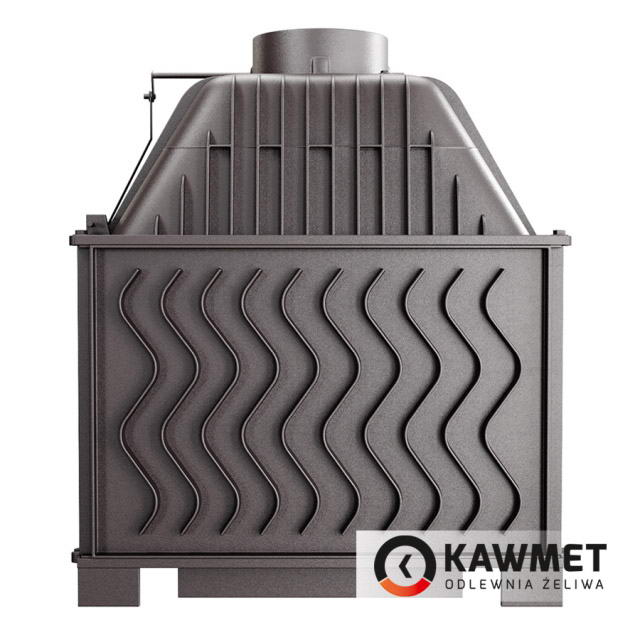 Для защиты корпуса каминной топки в конструкции топочной камеры также установлена двойная задняя стенка с красивым и объёмным рисунком, которая обеспечивает долговечность каминных топок KAWMET.