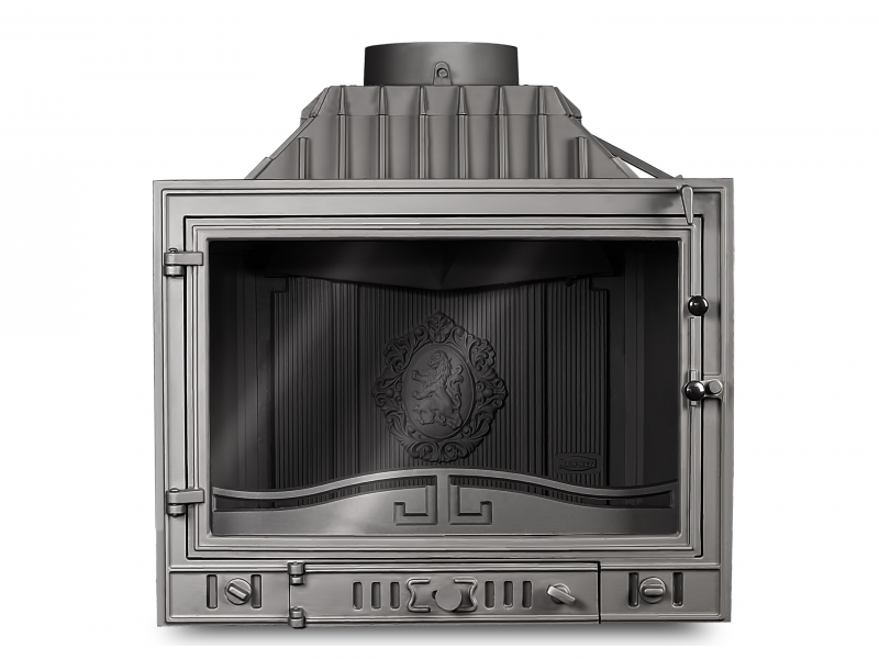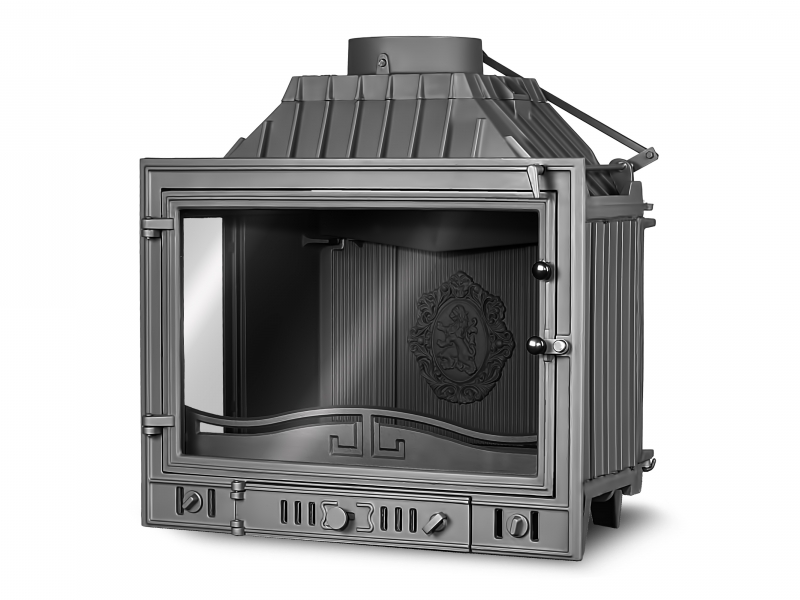 Классическая боковая каминная топка Kaw-Met W4 pb/lb 14,5 кВт с дополнительным стеклом для наслаждения игрой живого укрощенного огня с нескольких сторон, используется для отопления помещений как качественный дизайнерский отопительный прибор, а также как предмет интерьера. Жаростойкая плита в задней части топки декорирована гербом со львом.