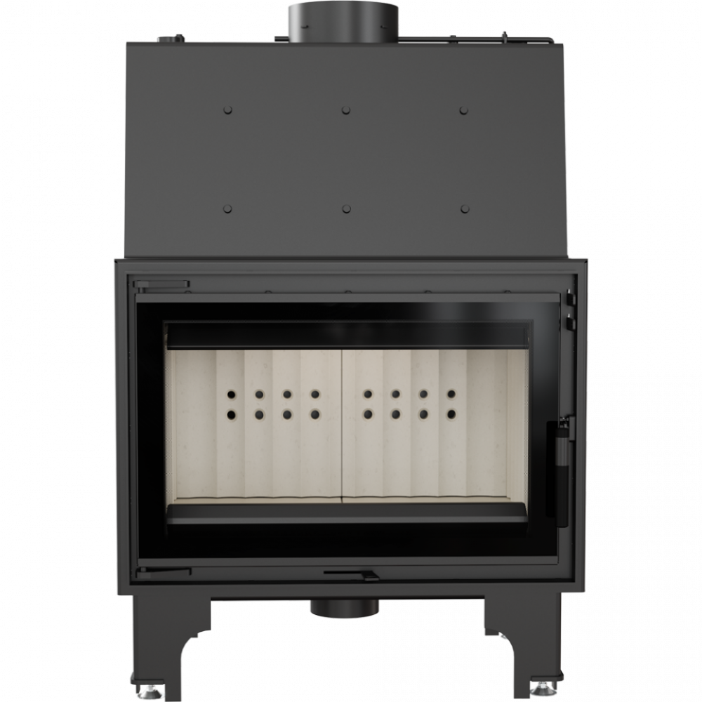 - Система аэрации камеры сгорания, реализована исключительно извне через доставку первичного и вторичного воздуха в камеру сгорания. Стандартно топка имеет подвод воздуха диаметром ø 125 мм, который дает возможность подать свежий воздух в камеру сгорания снаружи здания. Разделение воздуха проходит в пространстве ниже нижней плиты камеры сгорания. Воздух поступает каналом, который находится на высоте нижней плиты к забору, оборудованному вдоль всей длины системой отверстий. Это приводит к улучшениям условий сгорания шихты. Сгорание происходит равномерно по всей ширине камеры сгорания. Регулировка интенсивности сгорания в топке происходит с помощью механизма, который находится ниже дверец топки.