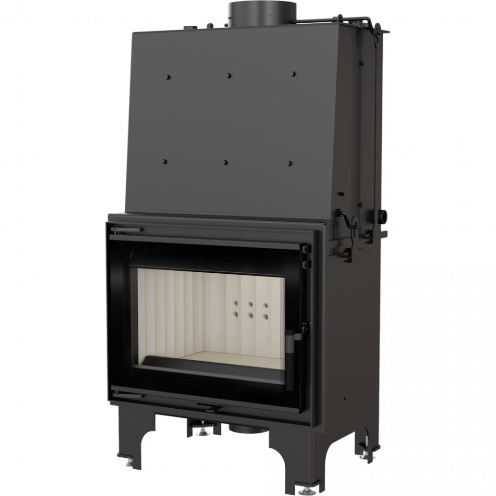 - Система аэрации камеры сгорания, реализована исключительно извне через доставку первичного и вторичного воздуха в камеру сгорания. Стандартно топка имеет подвод воздуха диаметром ø 125 мм, который дает возможность подать свежий воздух в камеру сгорания снаружи здания. Разделение воздуха проходит в пространстве ниже нижней плиты камеры сгорания. Воздух поступает каналом, который находится на высоте нижней плиты к забору, оборудованному вдоль всей длины системой отверстий. Это приводит к улучшениям условий сгорания шихты. Сгорание происходит равномерно по всей ширине камеры сгорания. Регулировка интенсивности сгорания в топке происходит с помощью механизма, который находится ниже дверец топки.