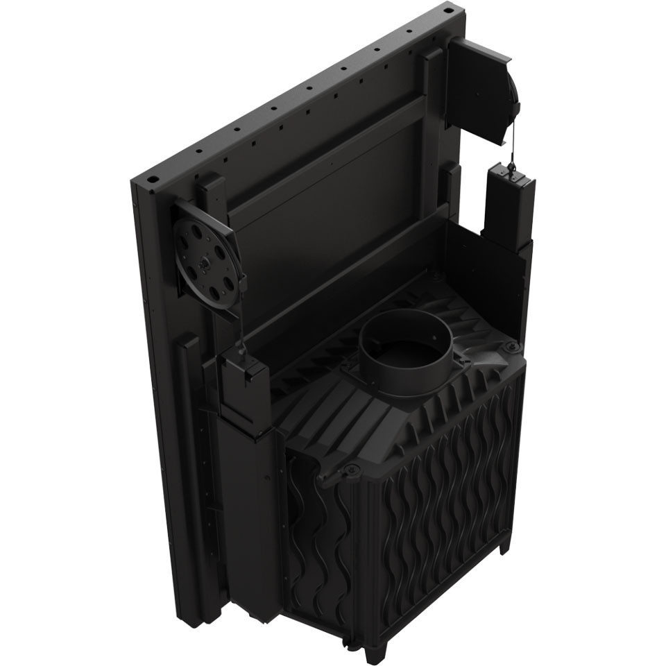 В такой топке дымовые газы совершают интенсивный дымооборот, с большим завихрением и дожигом. Это означает, что больше тепла передается в топочную камеру и топка имеет высокий КПД. Съемная ручка обеспечивает комфортную эксплуатацию, совмещает в себе функцию замка. Высокие чугунные радиаторные пластины обеспечивают отличную теплопередачу от рабочего камина на обогрев помещения. Надежность конструкции. Толстые чугунные стенки дают возможность эксплуатировать топки в режиме нон-стоп. Такое отопительное оборудование относится к агрегатам непрерывного действия.