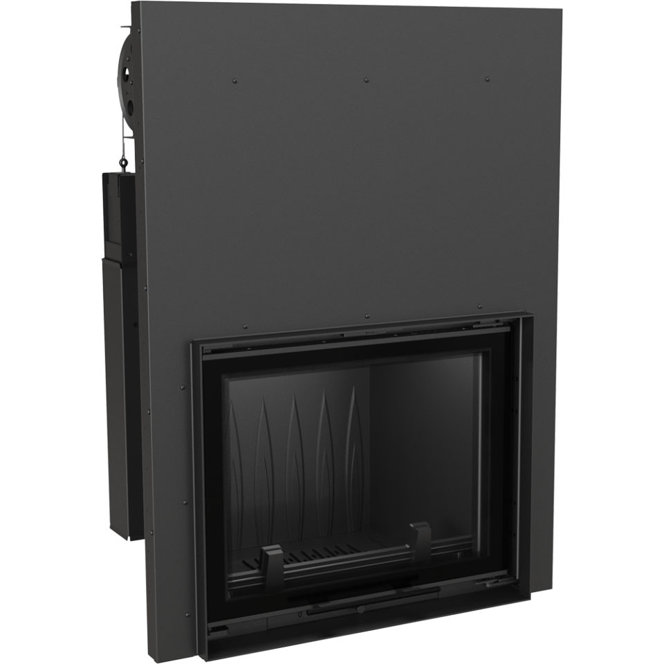 Чугунная каминная топка Kratki Felix/G (гильотина) с подъемной дверцей, декорированной стеклом, и трапециевидным основанием. Подъем двери легкий, практически без усилий. Угол открывания составляет 180°. Достигается это за счет противовеса, разгружающего вес двери. Модель имеет достаточно большую топочную камеру, в которую помещаются поленья длиной до 45 см. Дымосборник среднего размера, возвышается над топочной камерой. Его верхняя часть имеет плоскую форму.