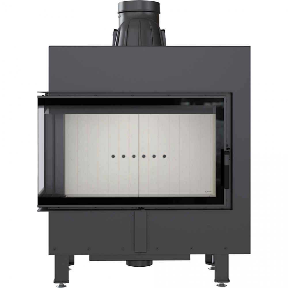 - Модель оснащена подвижным дымоходным отверстием, так что во время монтажа нет необходимости покупать дополнительные колена. Можно легко подобрать угол подключения топки к каминной инсталляции.