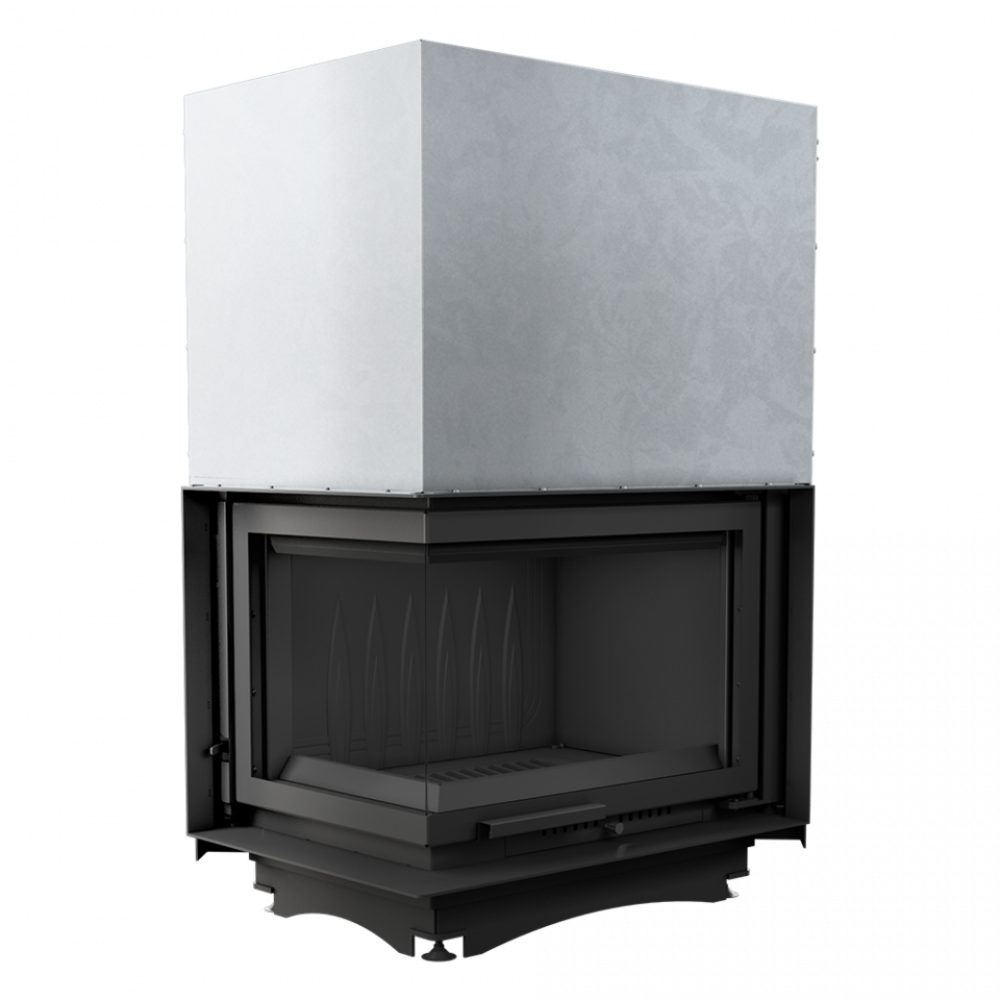 - Каминная топка с двумя стеклянными панелями, сопоставленными друг напротив друга под прямым углом (стеклянные панели соединены без рамы).