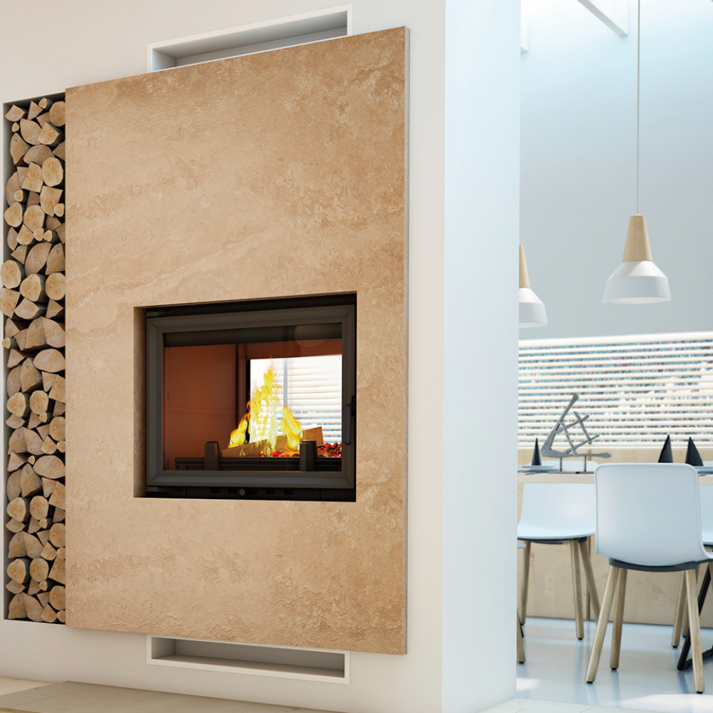 Такую топку можно установить в стену, разделяющую два смежных помещения – и это не только возможность видеть огонь, но и обогрев сразу двух помещений в доме. Остальные комнаты также можно обогревать с помощью данной топки – у нее имеется встроенный водяной контур, который подключается к радиаторной системе отопления.