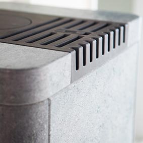 Отделка изготовлена из талькомагнезита. Камин может быть оснащен вентилятором и теплонакопительным блоком: это позволит отапливать помещение в течение восемнадцати часов после угасания огня. Поток горячего воздуха регулируется с помощью шиберной заслонки, размещенной в верхней части камина.