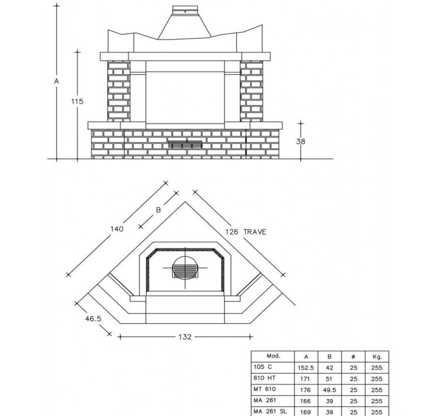 Облицовка из глиняного (необожженного) кирпича. Фронтальная часть, основание и вставки из полированного камня Giallo dIstria. Балка из древесины ели.