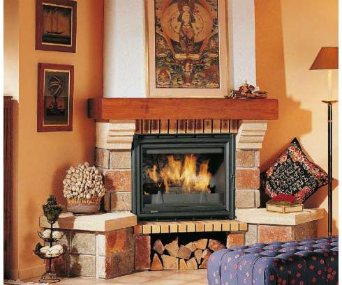 Этот угловой камин для интерьера в стиле модерн нельзя не заметить. Эта модель создана для того, чтобы привлекать внимание. Камин Palisse изготовлен из ракушечника и крупного цветного камня. Верхняя балка выточена из массива экзотического дерева под названием Ироко. По бокам от топки — две небольших удобных каминных полки.