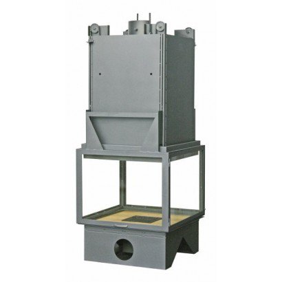 Топка предназначена для установки только в центре комнаты, оснащена подъемным механизмом, с помощью него все четыре стекла поднимаются вверх. Две противоположных стекла открываются вбок для удобства чистки камина. Корпус топки выполнен из легированной стали. Для установки топки необходимо дополнительно заказывать систему подвешивания. В зависимости от ситуации установки необходимо выбрать подходящий вариант подвешивания топки исходя из высоты помещения и верхней фиксации крепления. Очаговая зона основания выложена высокопрочным огнеупорным кирпичом.