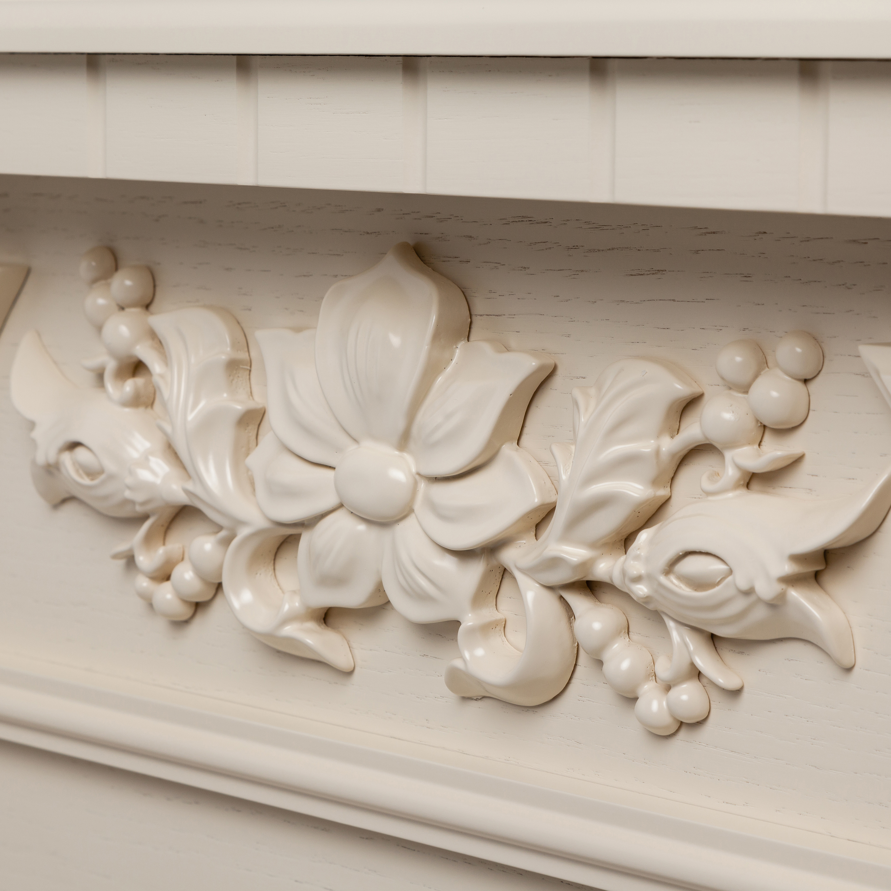 • Выполнен в классическом стиле. В центре портала - украшение в виде цветка и двухдекоративных рамок по бокам. Классический стиль камина подчеркивается утонченными рифлеными колоннами в античном стиле: капитель колонны украшена скульптурными спиралями - волютами. Столешница камина украшена характерным орнаментом лепного декора классического стиля.