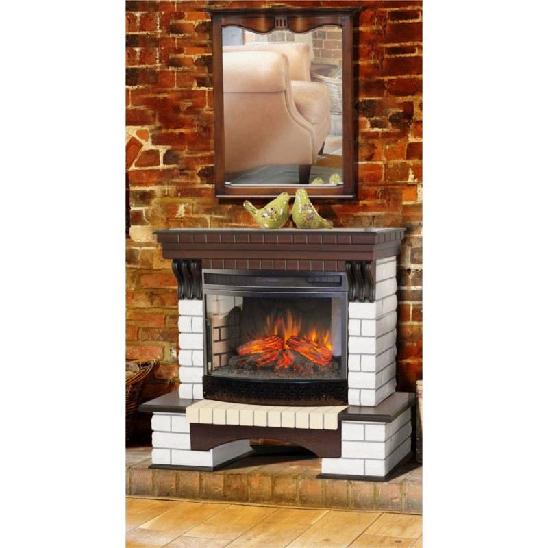 - Изготовлен из искусственного камня и МДФ, покрытого шпоном, - прочного, надежного и стойкого к любым внешним воздействиям материала. Сочетание светлого камня и темного дерева, декоративная фрезеровка. Дизайн дополнен выемкой для хранения дров в основании обрамления. С массивной каминной полкой.
