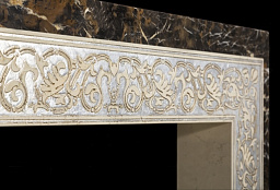 Зона очага изысканно обрамлена витым орнаментом, импосты и колонны, расположенные по бокам портала, не имеют яркой выраженности и обозначены лишь легким классическим барельефом.