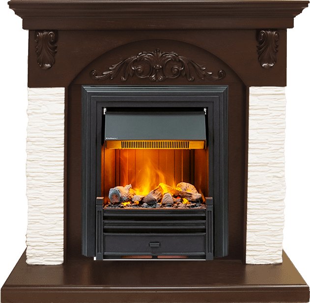 Каминокомплекта Dimplex Bern выполнен в классическом стиле. Он изготовлен из дерева и искусственного камня и представлен в нескольких цветовых решениях. Фронтальная часть портала украшена резным орнаментом, который придает нотки античности. Колонны выполнены из камня, столешница и постамент – из дерева. Зона очага визуально выделена деревянным обрамлением контрастного цвета.