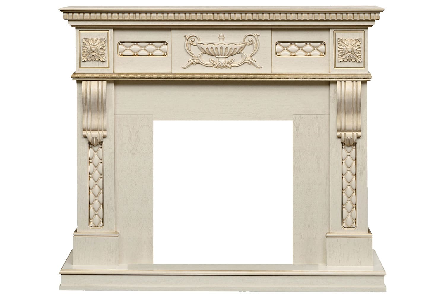 Боковые части портала и фронтон каминокомплект Dimplex Corsica украшены изящным золотым орнаментом. По центру фронтона расположена лепнина в виде античной амфоры. Кронштейны украшены декоративным узором.