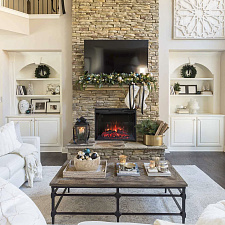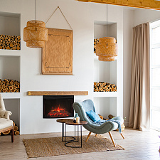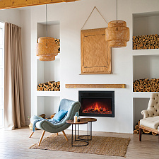 Главной особенностью широких каминов является наличие портала с «живым», ярким пламенем, которое привлекает к себе внимание и создает эффект играющего огня и тлеющих дров.