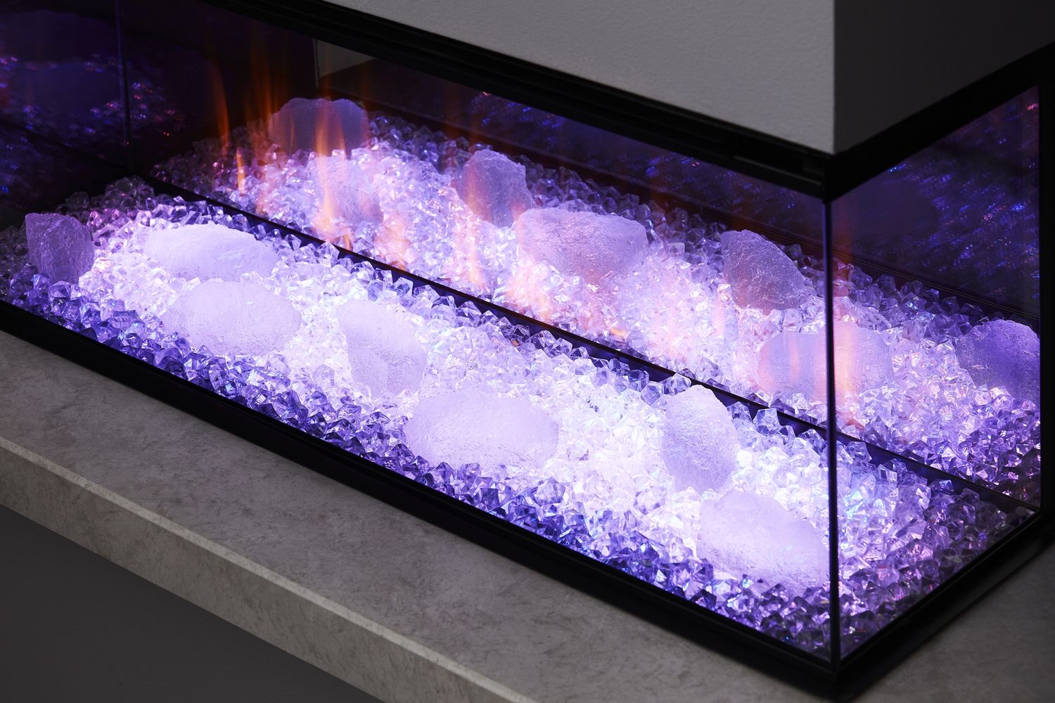 - Функция верхней подсветки: Освещает декоративные элементы (дрова и кристаллы), создавая отражение на задней зеркальной стенке, что усиливает визуальную глубину топки.